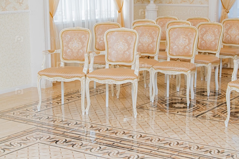 Ряды роскошных дорогих светло-бежевых стульев классического дизайна для особого мероприятия