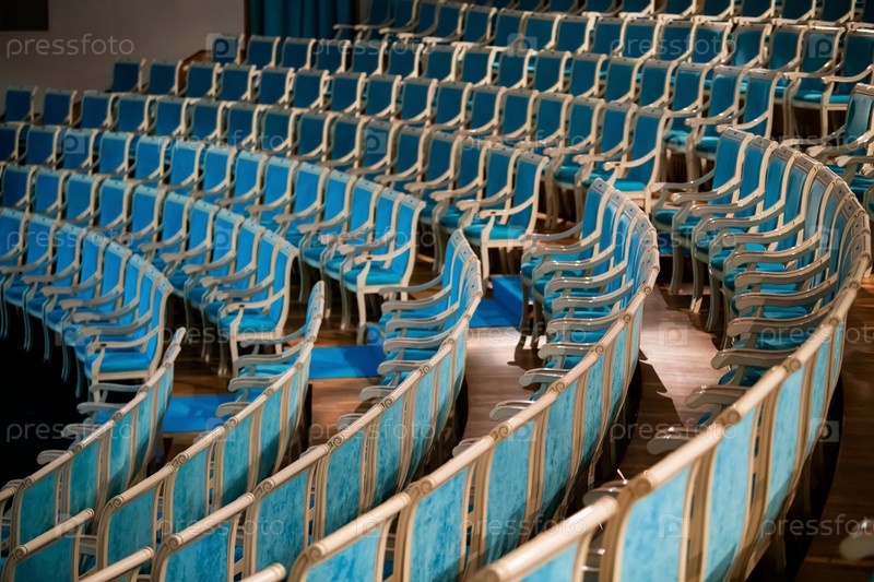 Ряды роскошных, дорогих, синих кресел классического дизайна в зрительном зале классического академического театра
