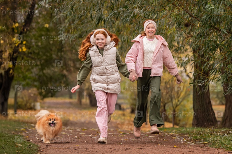 Две счастливые девочки-сестры бегут по тропинке осеннего парка со своей собакой померанским шпицем
