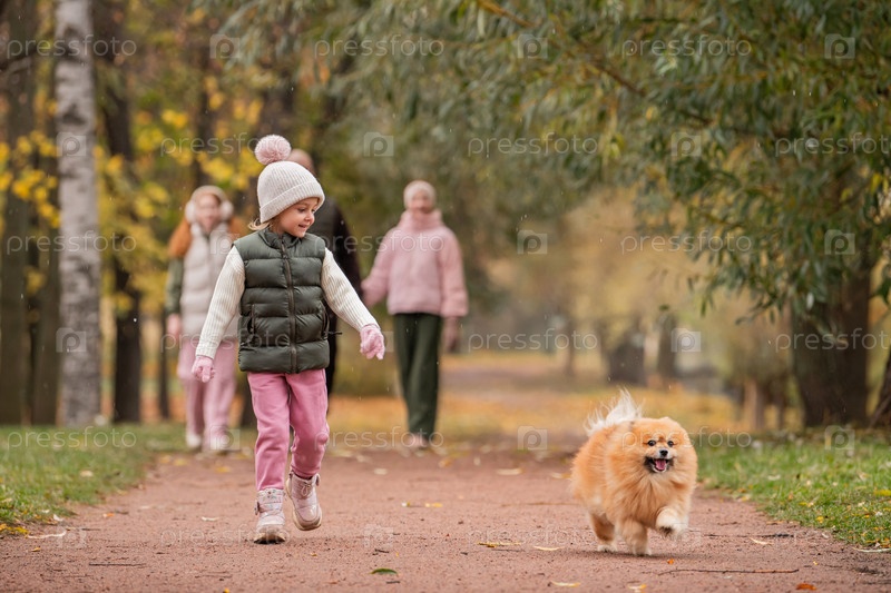 Маленькая девочка и ее питомец померанский шпиц бегут по тропинке в осеннем городском парке