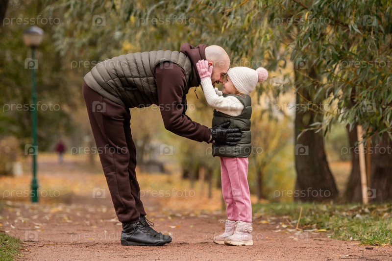 Маленькая дочь обнимает своего любящего отца во время прогулки в осеннем парке. День отца