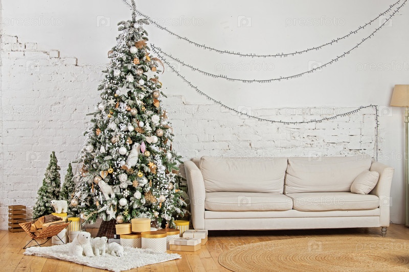 Рождественская елка и белый диван в элегантной гостиной с белой стеной и деревянным полом с местом для копирования для праздничного декора