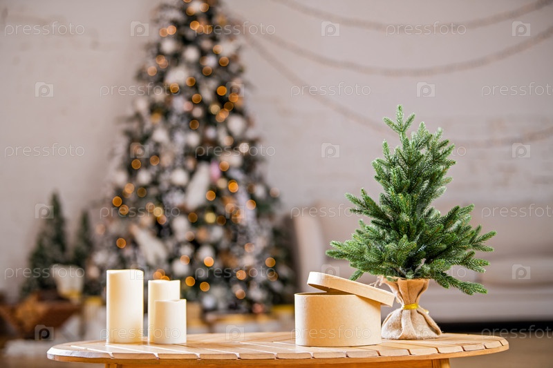 Пустой деревянный стол или пол с рождественскими элементами на размытом фоне елки. Для демонстрации продукта или монтажа