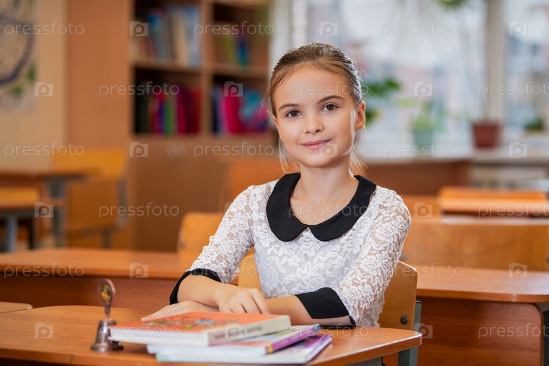 Портрет школьницы, сидящей за партой в классной комнате