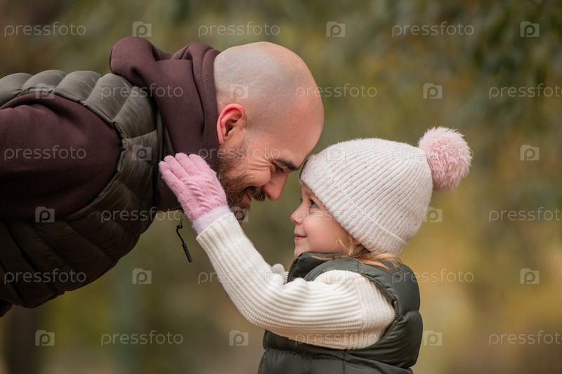 Маленькая дочь обнимает своего любящего отца во время прогулки в осеннем парке. День отца