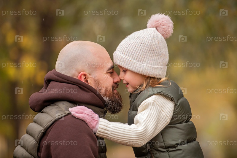 Маленькая дочь обнимает своего любящего отца во время прогулки в осеннем парке. День отца