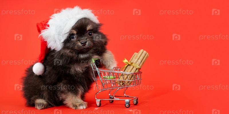 Милый пушистый щенок шпица в шапке Санта-Клауса на красном фоне с тележкой для покупок с едой