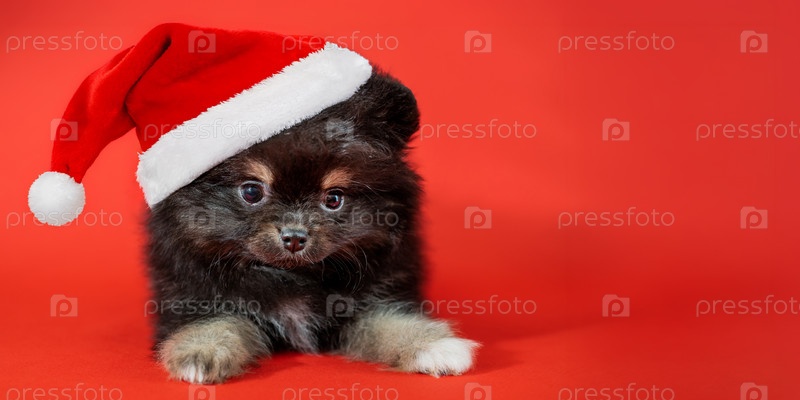 Милый пушистый щенок шпица в шапке Санта-Клауса на красном фоне с рождественскими украшениями и еловой веткой