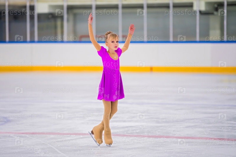 Портрет маленькой девочки в полный рост, занимающейся фигурным катанием на крытом катке во время выступления, место для копирования