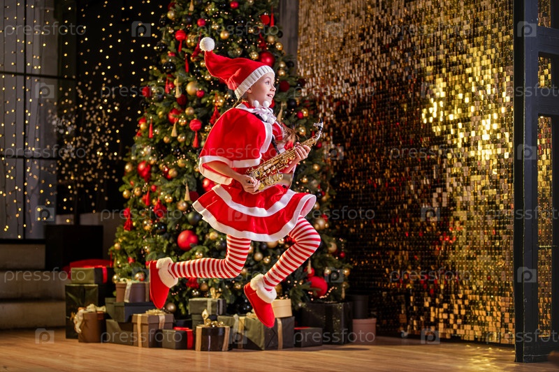 Девочка в красной рождественской шапке Санты играет на саксофоне возле рождественской елки в украшенном зале. Рождественская детская музыкальная концепция