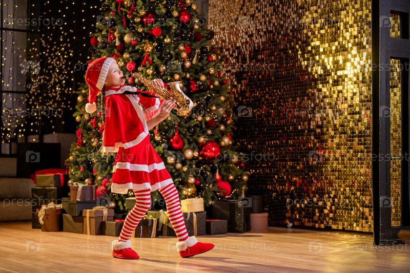 Девочка в красной рождественской шапке Санты играет на саксофоне возле рождественской елки в украшенном зале