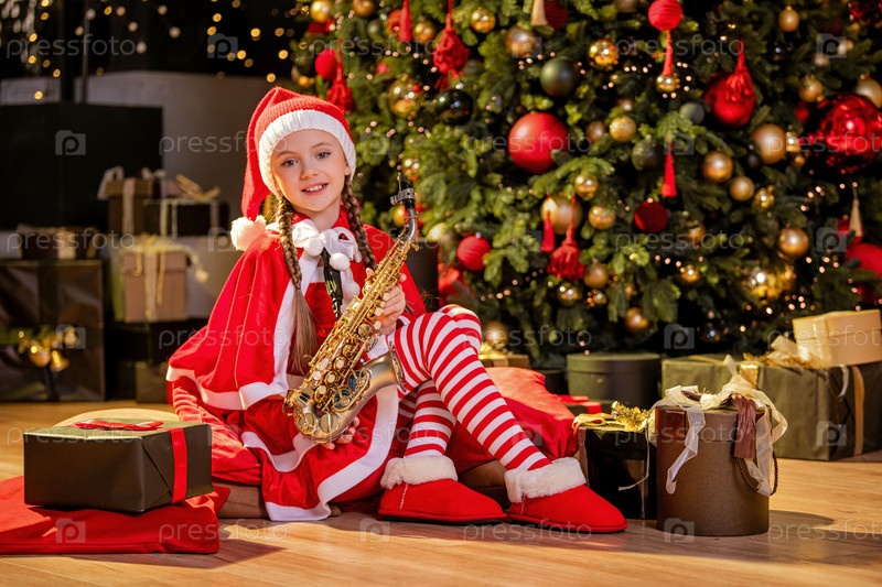 Девочка в красной рождественской шапке Санты играет на саксофоне возле рождественской елки в украшенном зале. Рождественская детская музыкальная концепция