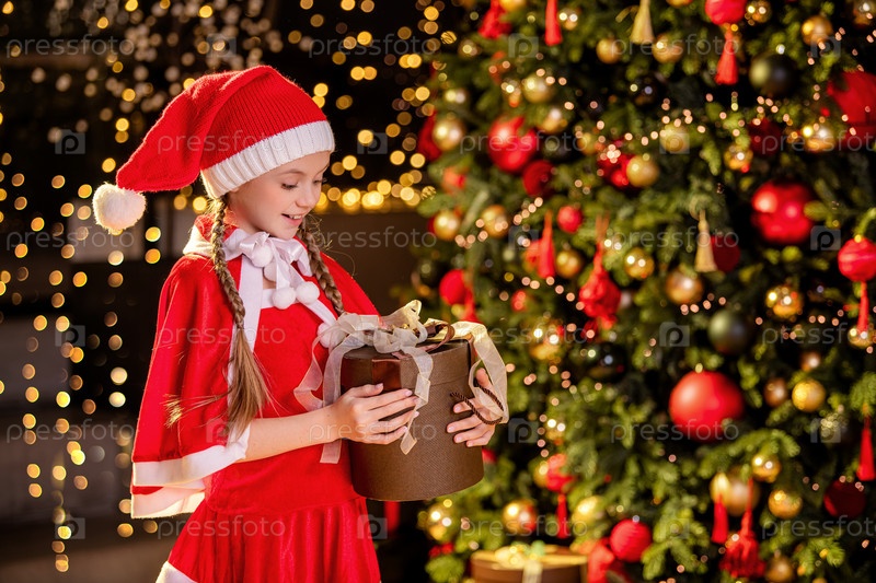 Милая и счастливая девушка в красной одежде и шапке Санты держит подарочную коробку на фоне рождественской вечеринки, пространство для копирования