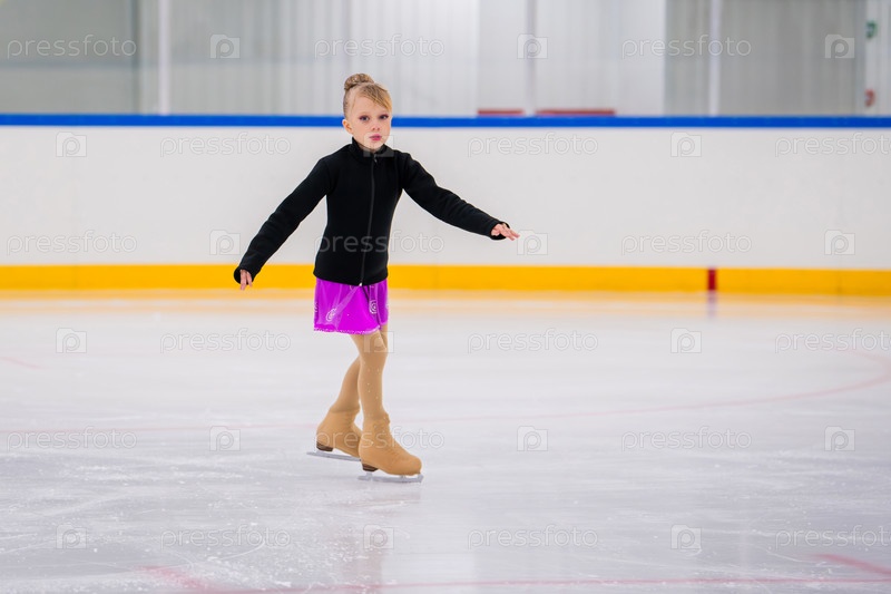 Портрет маленькой девочки в полный рост, занимающейся фигурным катанием на крытом катке во время выступления, место для копирования