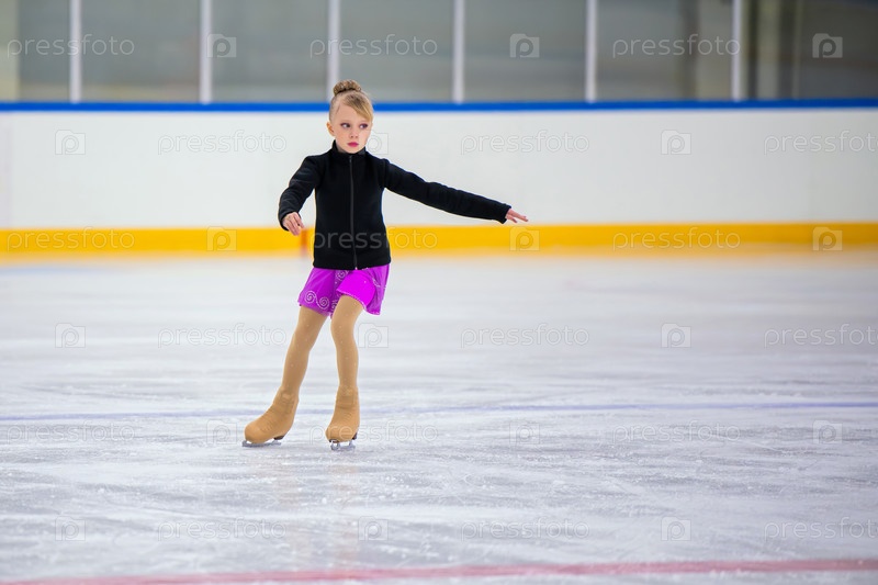 Портрет маленькой девочки в полный рост, занимающейся фигурным катанием на крытом катке во время выступления, место для копирования