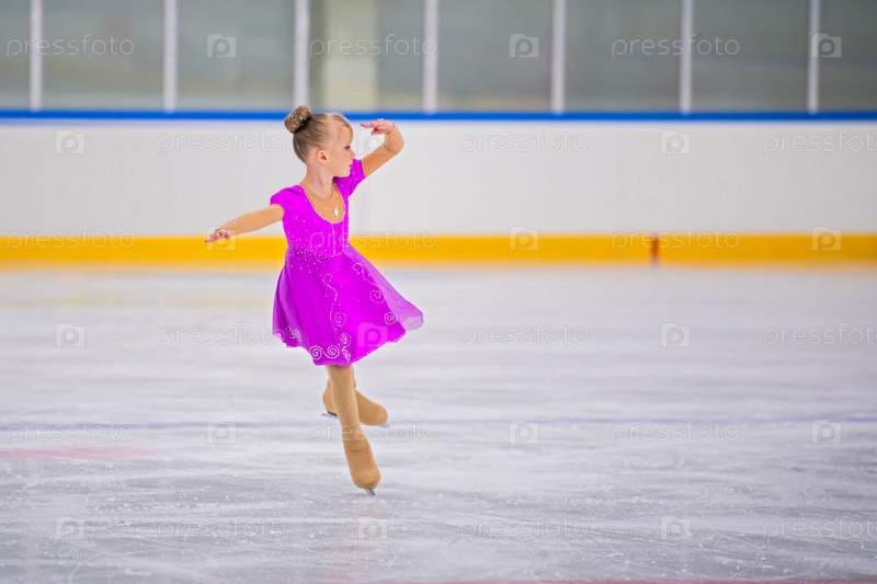 Портрет маленькой девочки в полный рост, занимающейся фигурным катанием на крытом катке во время выступления, место для копирования