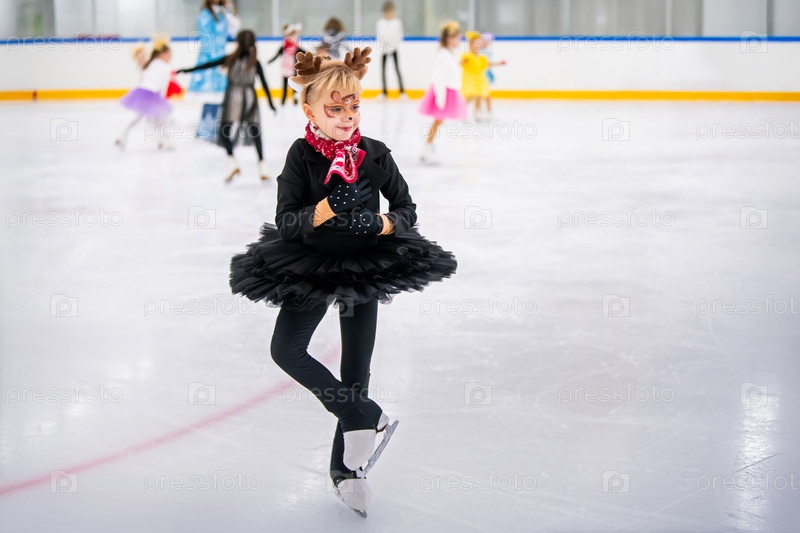Маленькая девочка в костюме оленя катается на катке, детский спортивный фестиваль