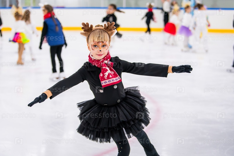 Портрет маленькой девочки-фигуристки в костюме оленя с акварельным макияжем на лице на катке, детский спортивный фестиваль, Рождество