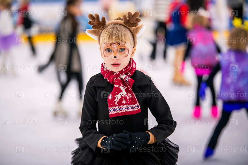 Портрет маленькой девочки-фигуристки в костюме оленя с акварельным макияжем на лице на катке, Рождество