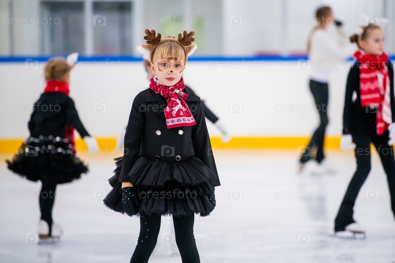 Маленькая девочка в костюме оленя катается на катке, детский спортивный фестиваль