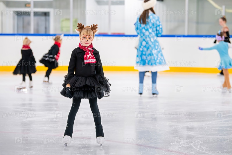 Маленькая девочка в костюме оленя катается на катке, детский спортивный фестиваль
