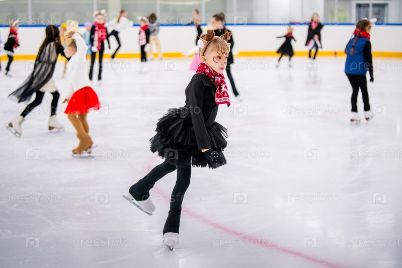 Маленькая девочка в костюме оленя катается на катке, детский спортивный фестиваль