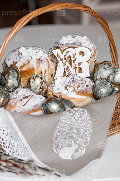 Пасхальные яйца с золотом, куличи и перники в форме букв XB в плетеной корзине из винограда