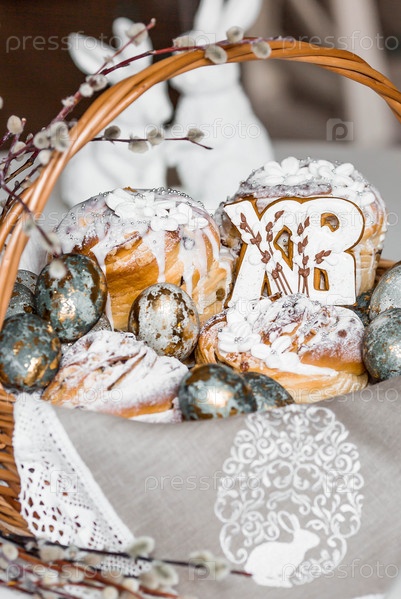 Пасхальные яйца с золотом, куличи и перники в форме букв XB в плетеной корзине из винограда