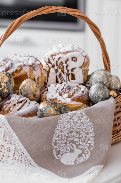 Пасхальные яйца с золотом, куличи и перники в форме букв XB в плетеной корзине из винограда
