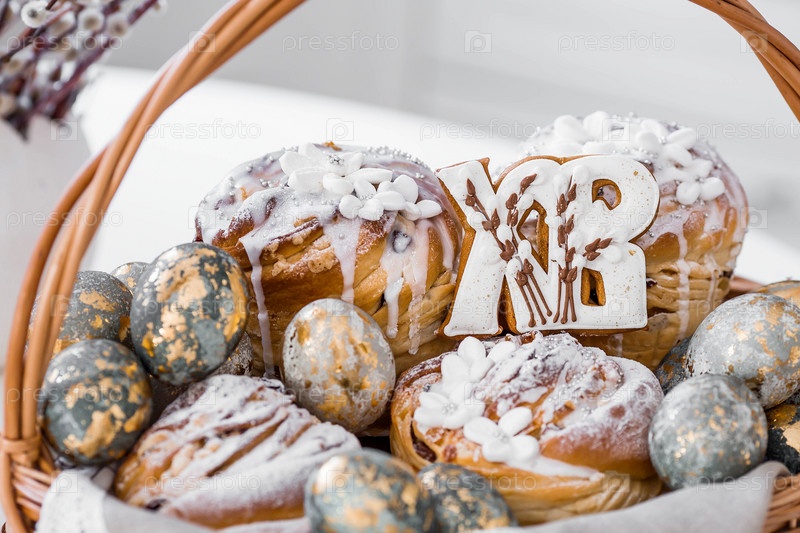 Пасхальные яйца с золотом, куличи и перники в форме букв XB в плетеной корзине из винограда