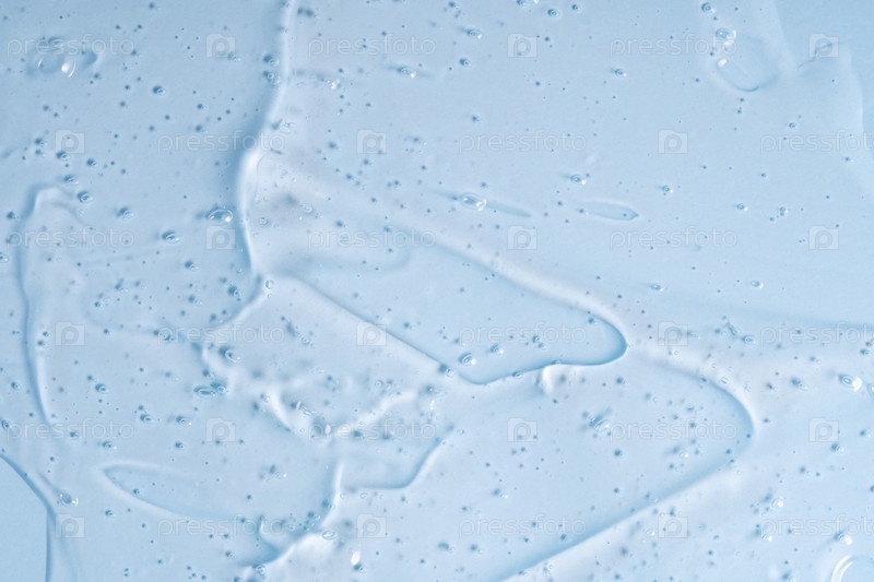 Текстура геля глицерина. Прозрачный мазок сыворотки на синем фоне. Жидкий гель-увлажнитель с пузырьками макро