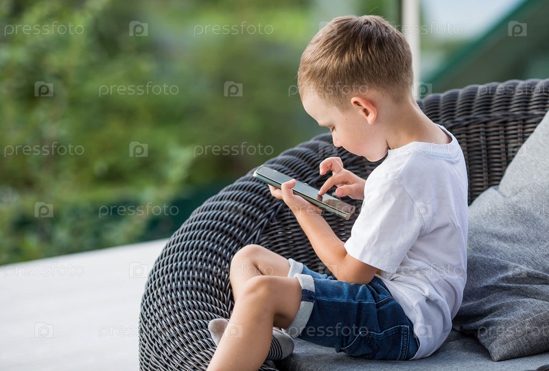 5-летний мальчик со смартфоном в руках на веранде. Ребенок играет в телефон. Вред гаджетов для детей. Защитите ребенка от смартфона. Дети и гаджеты