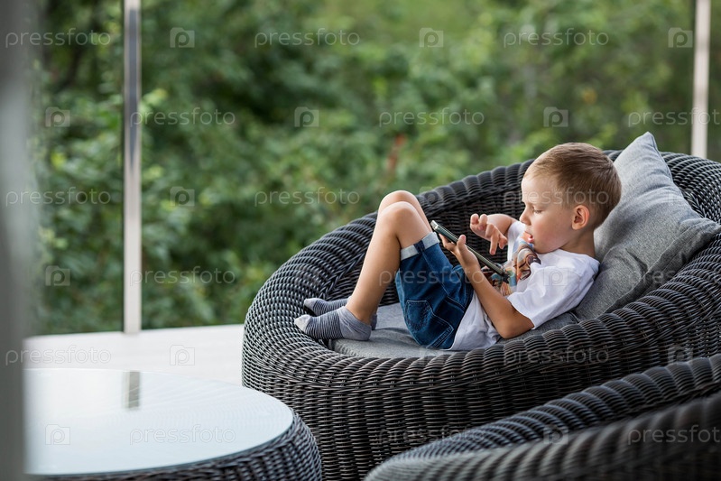 5-летний мальчик со смартфоном в руках на веранде. Ребенок играет в телефон. Вред гаджетов для детей. Защитите ребенка от смартфона. Дети и гаджеты