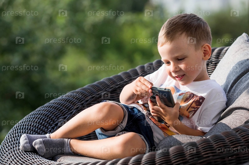 5-летний мальчик со смартфоном в руках на веранде. Ребенок играет в телефон. Вред гаджетов для детей. Защитите ребенка от смартфона. Дети и гаджеты