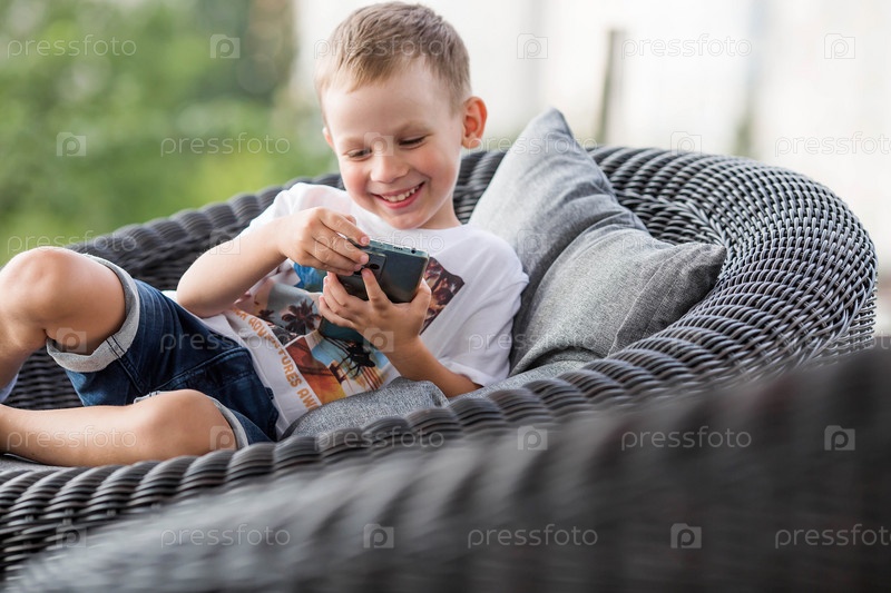 5-летний мальчик со смартфоном в руках на веранде. Ребенок играет в телефон. Вред гаджетов для детей. Защитите ребенка от смартфона. Дети и гаджеты