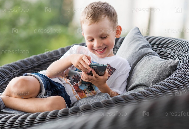 5-летний мальчик со смартфоном в руках на веранде. Ребенок играет в телефон. Вред гаджетов для детей. Защитите ребенка от смартфона. Дети и гаджеты