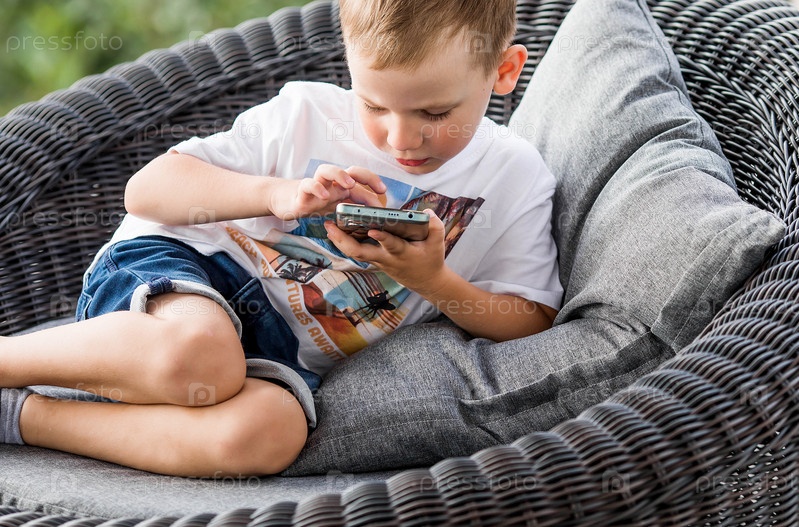 5-летний мальчик со смартфоном в руках на веранде. Ребенок играет в телефон. Вред гаджетов для детей. Защитите ребенка от смартфона. Дети и гаджеты
