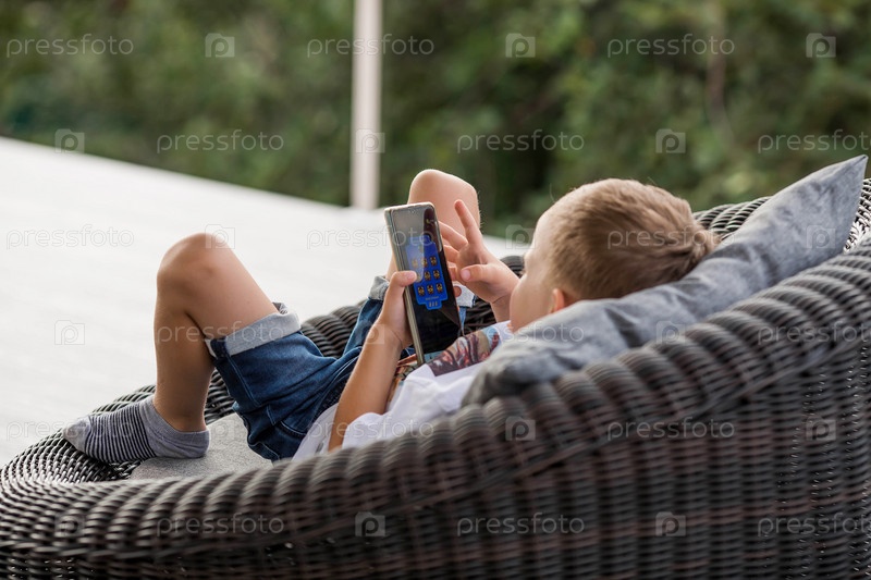 5-летний мальчик со смартфоном в руках на веранде. Ребенок играет в телефон. Вред гаджетов для детей. Защитите ребенка от смартфона. Дети и гаджеты