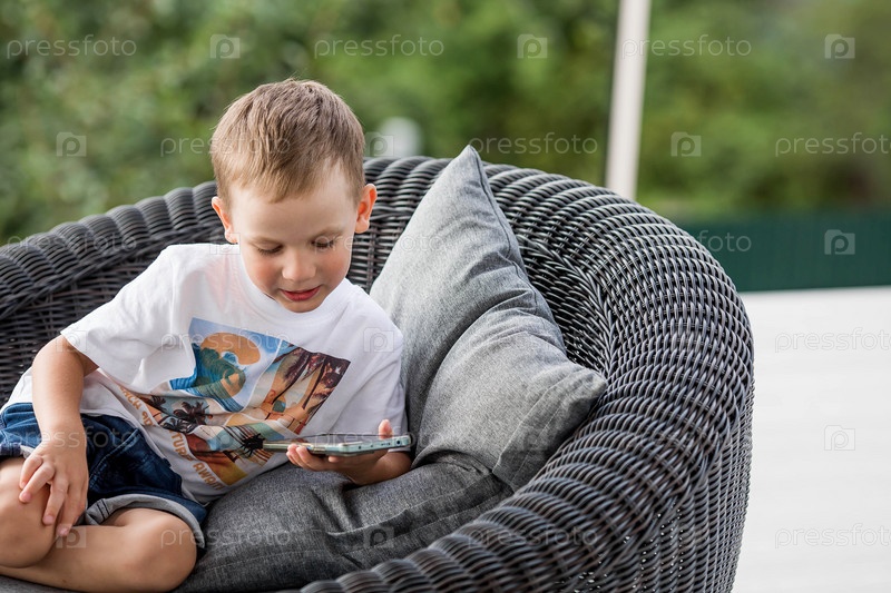5-летний мальчик со смартфоном в руках на веранде. Ребенок играет в телефон. Вред гаджетов для детей. Защитите ребенка от смартфона. Дети и гаджеты