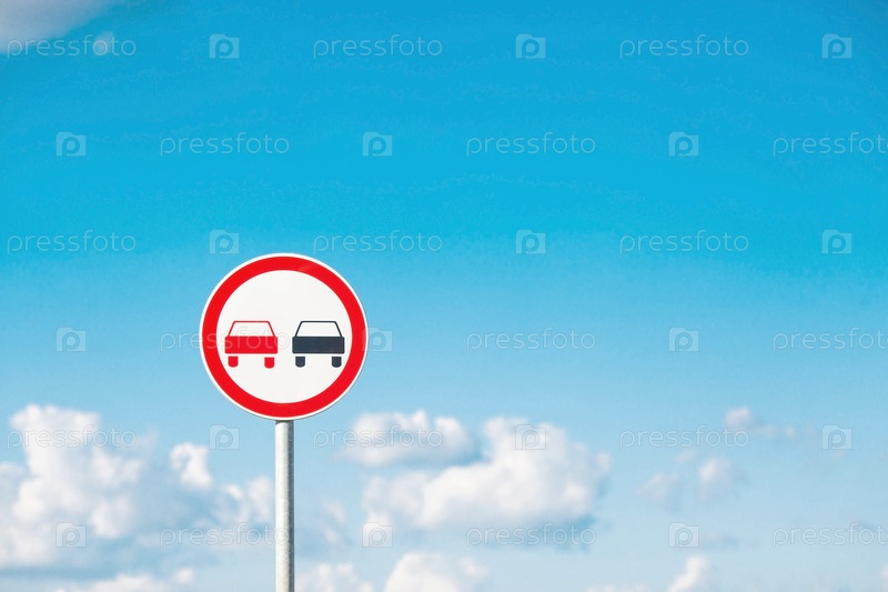Правила дорожного движения. Внимание. Обгон запрещен. Дорожный знак на металлическом столбе на фоне голубого неба и белых облаков