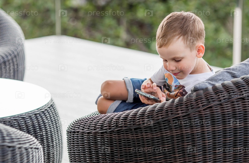 5-летний мальчик со смартфоном в руках на веранде. Ребенок играет в телефон. Вред гаджетов для детей. Защитите ребенка от смартфона. Дети и гаджеты