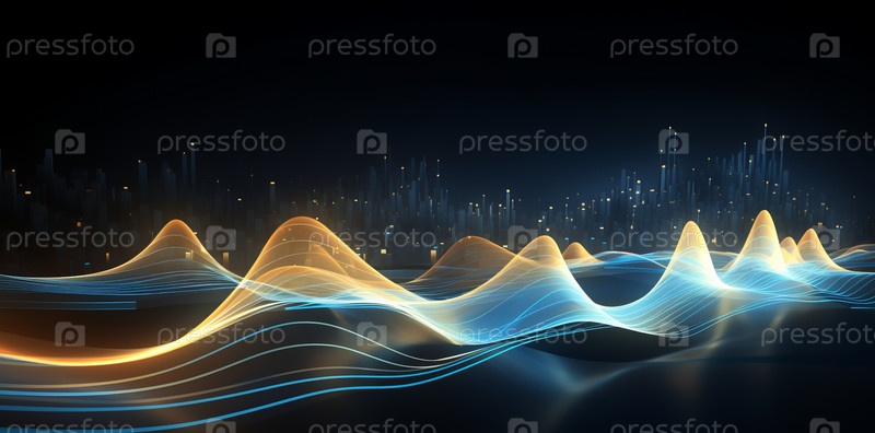 Абстрактные синие и желтые волны на темном фоне и огни боке