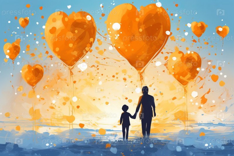 Два силуэта держатся за руки, ребенок маленький и одет в красную рубашку, а взрослый в черную футболку стоит на вершине холма с воздушным шаром в форме сердца в форме дерева, парящим в небе, полным светящихся сердец, летающих вокруг них, романтическая сце
