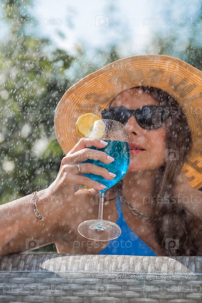 Молодая женщина в купальнике и солнцезащитных очках в джакузи со стаканом коктейля Blue Lagoon на фоне бассейна.Концепция летних каникул, отпуска и пенной вечеринки