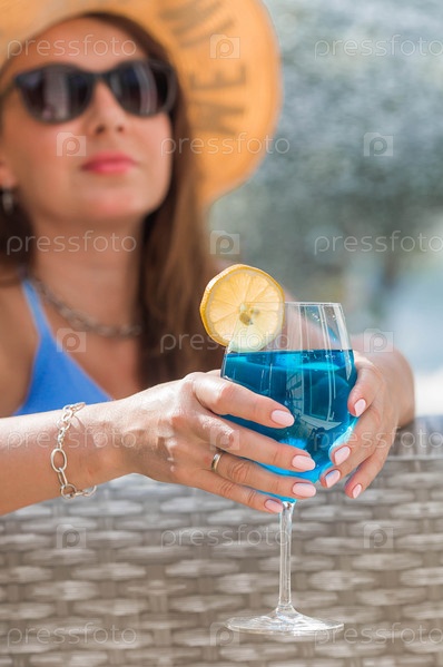 Молодая женщина в купальнике и солнцезащитных очках в джакузи со стаканом коктейля Blue Lagoon на фоне бассейна.Концепция летних каникул, отпуска и пенной вечеринки
