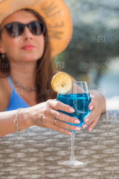 Молодая женщина в купальнике и солнцезащитных очках в джакузи со стаканом коктейля Blue Lagoon на фоне бассейна.Концепция летних каникул, отпуска и пенной вечеринки
