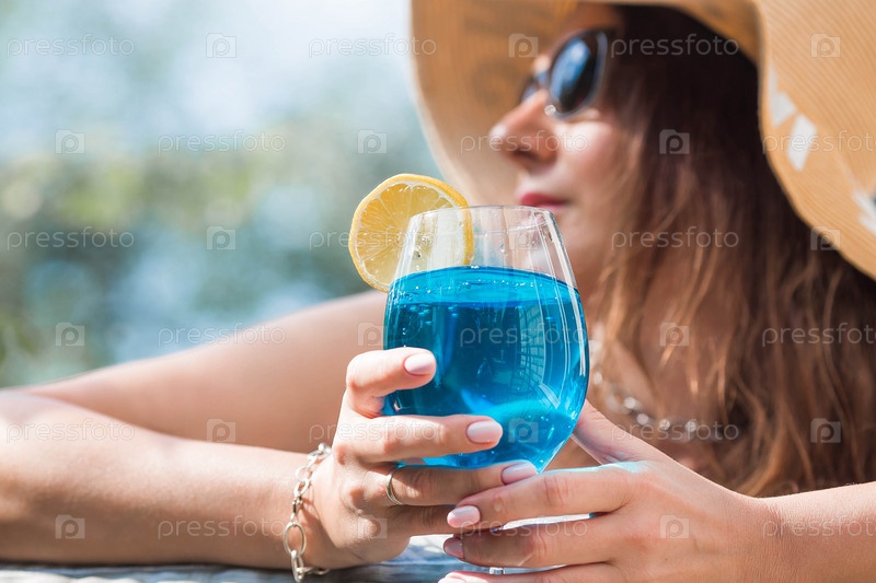 Молодая женщина в купальнике и солнцезащитных очках в джакузи со стаканом коктейля Blue Lagoon на фоне бассейна.Концепция летних каникул, отпуска и пенной вечеринки