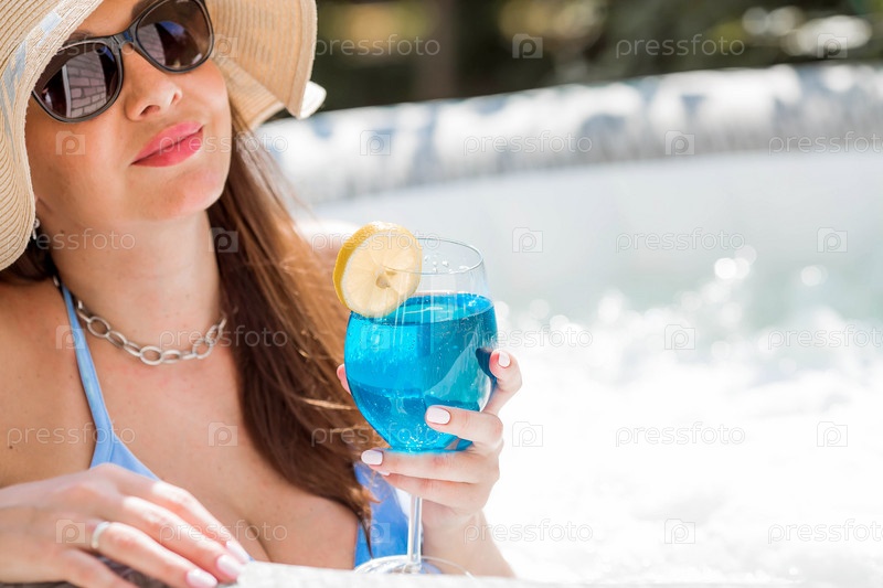 Молодая женщина в купальнике и солнцезащитных очках в джакузи со стаканом коктейля Blue Lagoon на фоне бассейна.Концепция летних каникул, отпуска и пенной вечеринки