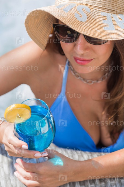 Молодая женщина в купальнике и солнцезащитных очках в джакузи со стаканом коктейля Blue Lagoon на фоне бассейна.Концепция летних каникул, отпуска и пенной вечеринки