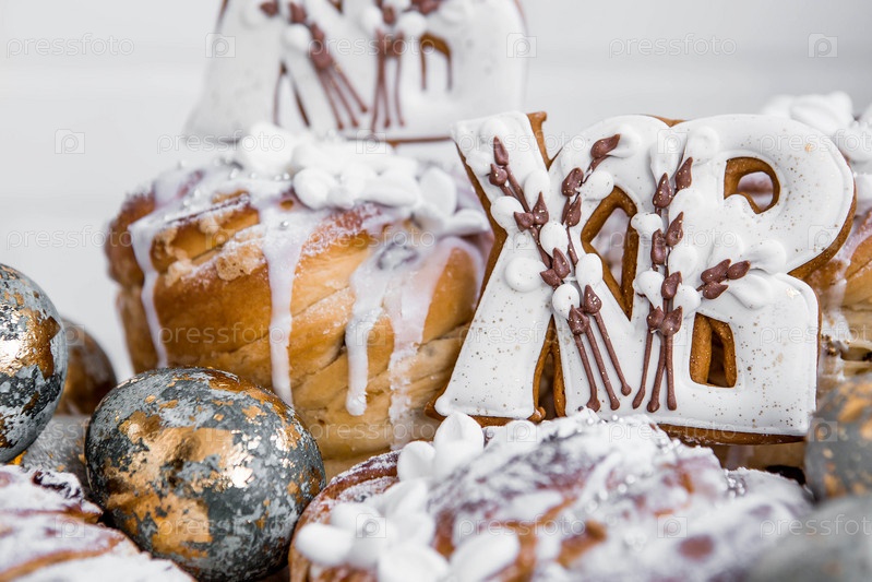 Пасхальные яйца с золотом, куличи и перники в форме букв XB в плетеной корзине из винограда